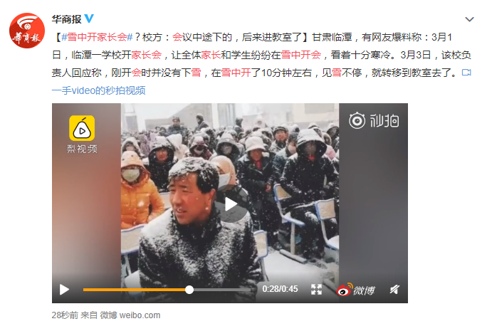 近日甘肅一學(xué)校雪中開家長(zhǎng)會(huì)在網(wǎng)上引起了熱議。
