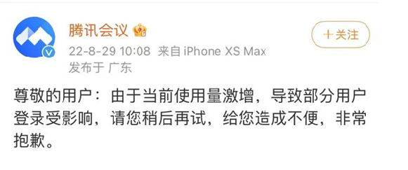 摘要: 8月29日上午,騰訊會(huì)議崩潰了登上微博熱搜,網(wǎng)友反應(yīng),不少上網(wǎng)課的同學(xué)遇到了閃退,導(dǎo)致網(wǎng)絡(luò)遠(yuǎn)程教學(xué)中斷。對(duì)此,騰訊會(huì)議在微博回應(yīng)稱:由于當(dāng)前使用量激增,導(dǎo)致部分用戶登錄受影響,請(qǐng)您稍后再試,給您造成不便,非常抱歉。 騰訊會(huì)議是騰訊...
